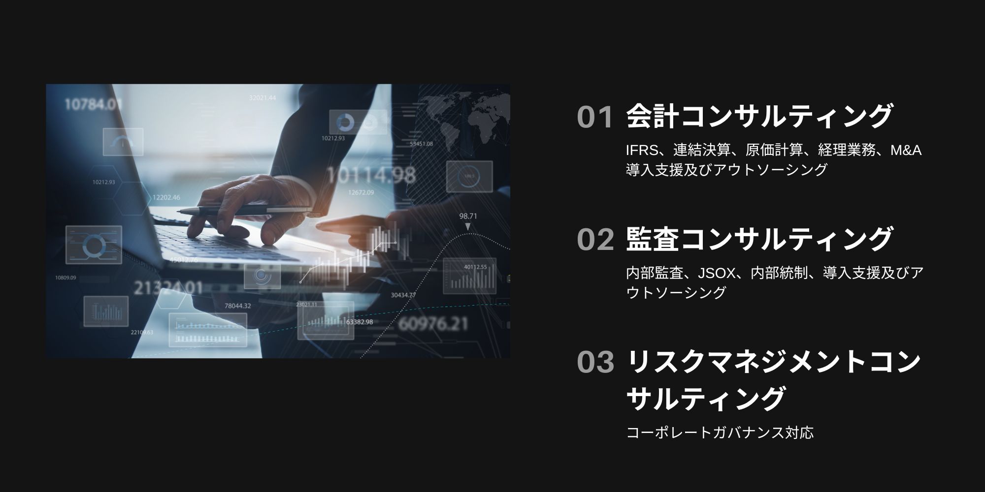 監査、会計、リスクマネジメントに関するコンサルティング及びアウトソーシングを通じてクライアントの健全な成長をサポートします。